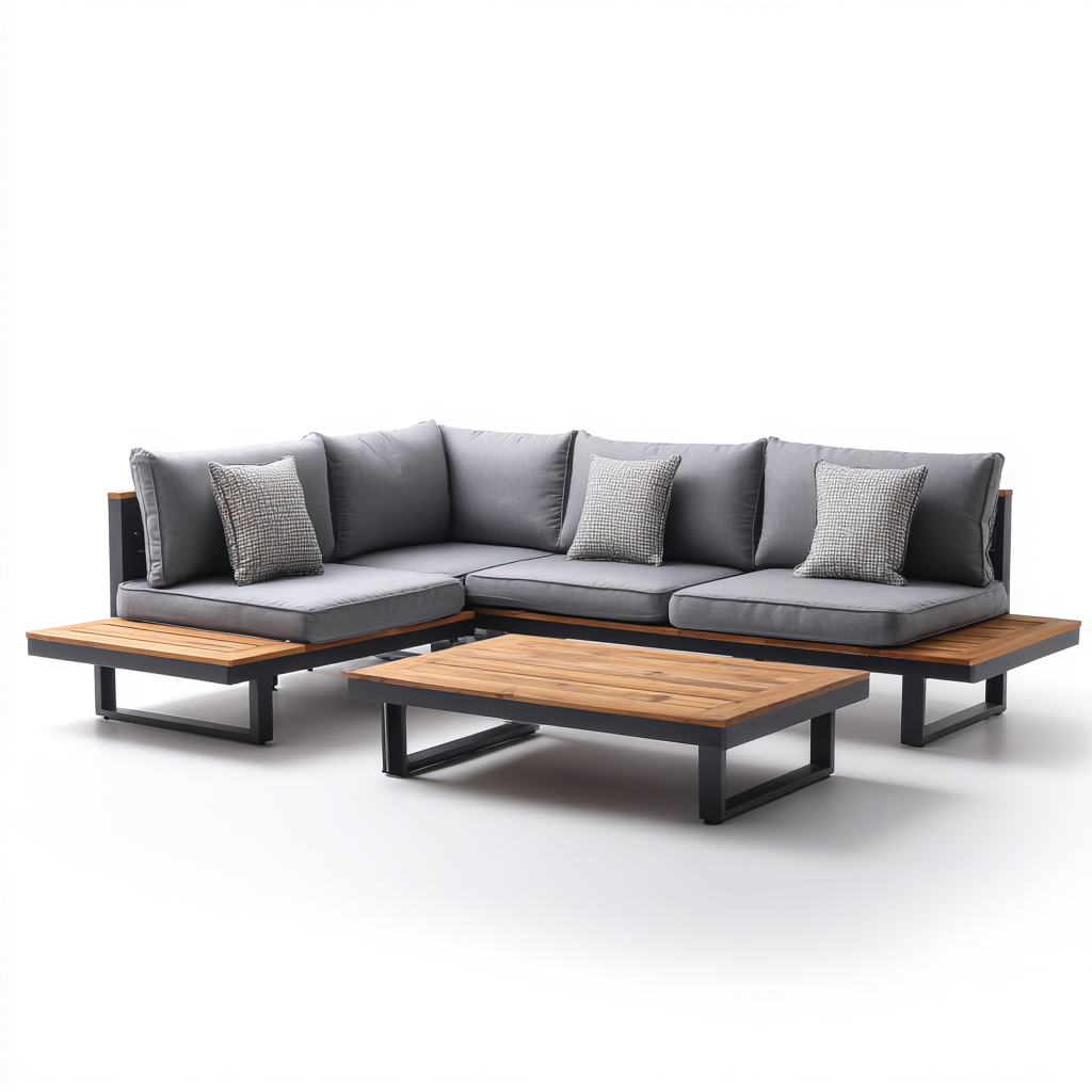 Divano da esterno set in metallo e legno con cuscini in tessuto 250x160x70 cm con tavolino 100x60x35 cm - grigio-legno naturale - design moderno